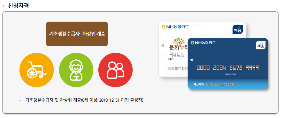 문화누리카드는 기초생활수급자와 차상위계층(6세 이상, 2019년 12월 31일 이전 출생자)을 대상으로 합니다.
