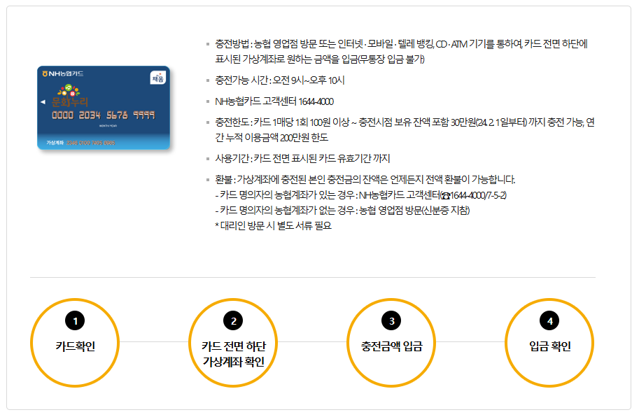 농협 영업점 방문, 인터넷·모바일·텔레뱅킹, CD·ATM 기기를 이용한 가상계좌 입금(무통장 입금 불가) 등의 방법으로 충전할 수 있으며, 충전 가능 시간은 오전 9시부터 오후 10시까지입니다.