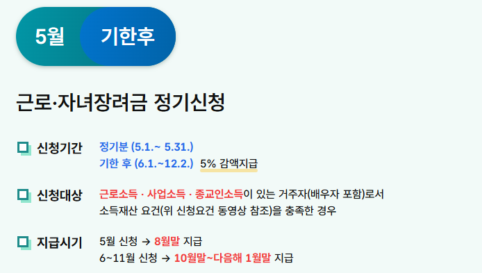 근로장려금 신청은 정기 신청과 반기 신청으로 나뉩니다. 신청기간에 맞춰 신청해야만 지급받을 수 있습니다.